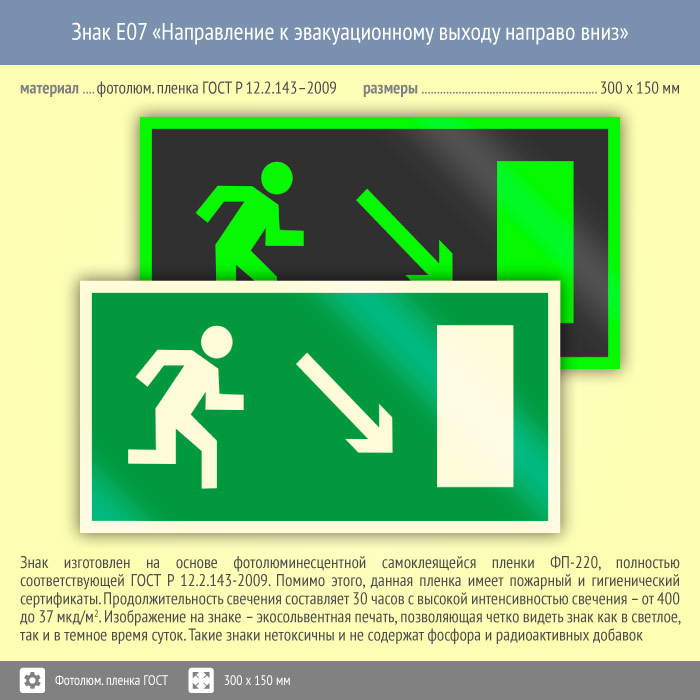 Знак E07 «Направление к эвакуационному выходу направо вниз» (фотолюминесцентная пленка ГОСТ 34428-2018, 300х150 мм) в Рыбинске купить