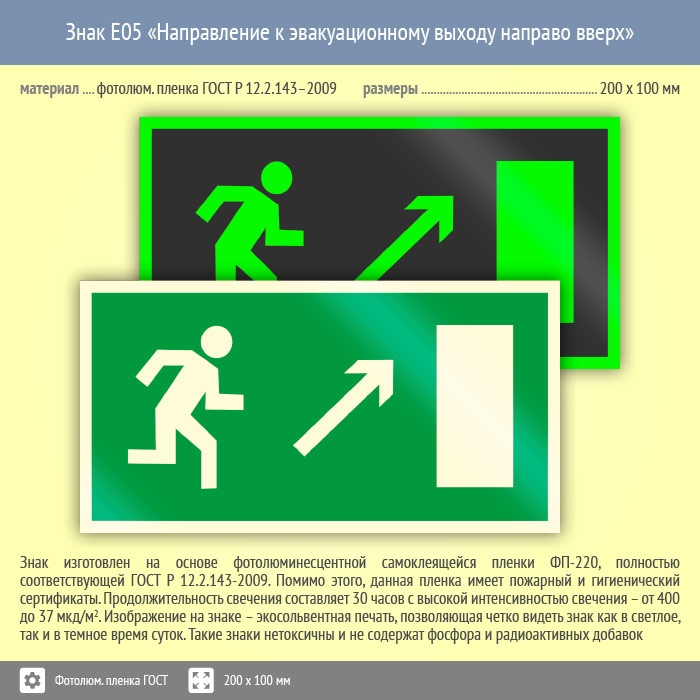 Знак E05 «Направление к эвакуационному выходу направо вверх» (фотолюминесцентная пленка ГОСТ 34428-2018, 200х100 мм) в Рыбинске купить