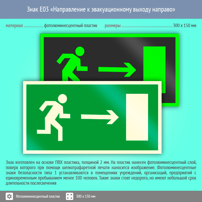 Знак E03 «Направление к эвакуационному выходу направо» (фотолюминесцентный пластик, 300х150 мм) в Рыбинске купить