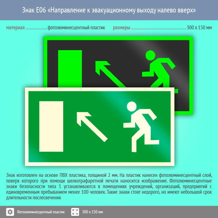 Знак E06 «Направление к эвакуационному выходу налево вверх» (фотолюминесцентный пластик, 300х150 мм) в Рыбинске купить