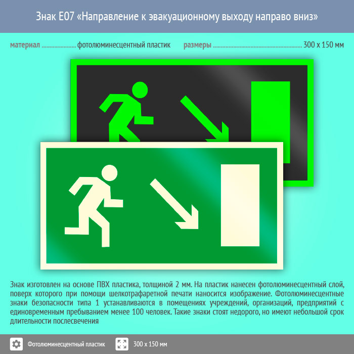 Знак E07 «Направление к эвакуационному выходу направо вниз» (фотолюминесцентный пластик, 300х150 мм) в Рыбинске купить
