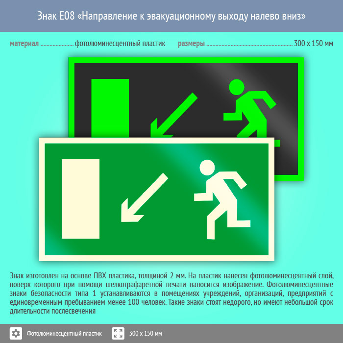 Знак E08 «Направление к эвакуационному выходу налево вниз» (фотолюминесцентный пластик, 300х150 мм) в Рыбинске купить