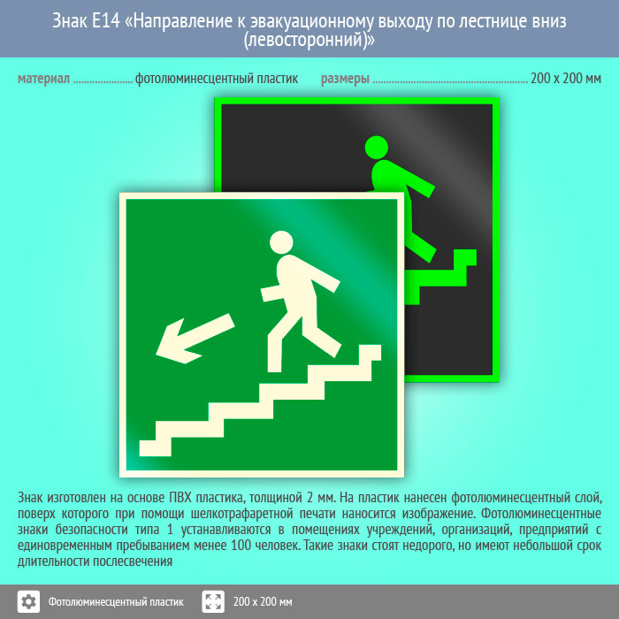 Знак E14 «Направление к эвакуационному выходу по лестнице вниз (левосторонний)» (фотолюминесцентный пластик, 200х200 мм) в Рыбинске купить