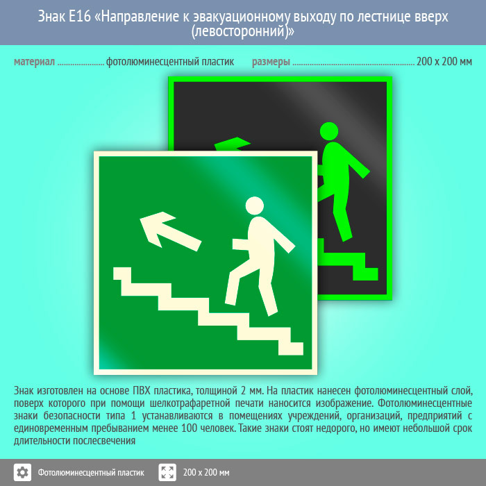 Знак E16 «Направление к эвакуационному выходу по лестнице вверх (левосторонний)» (фотолюминесцентный пластик, 200х200 мм) в Рыбинске купить