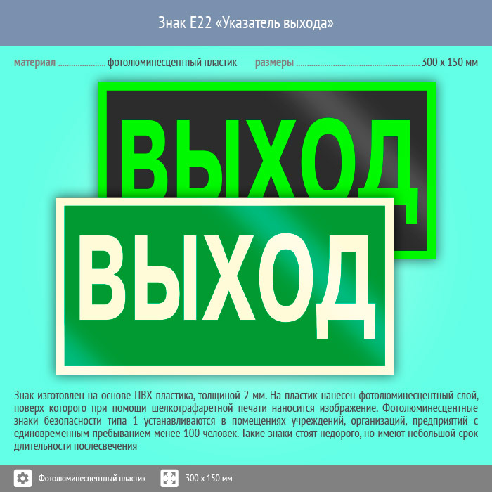 Знак E22 «Указатель выхода» (фотолюминесцентный пластик, 300х150 мм) в Рыбинске купить