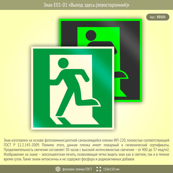 Знак E01-01 «Выход здесь (левосторонний)» (фотолюминесцентная пленка ГОСТ 34428-2018, 150х150 мм) в Рыбинске купить