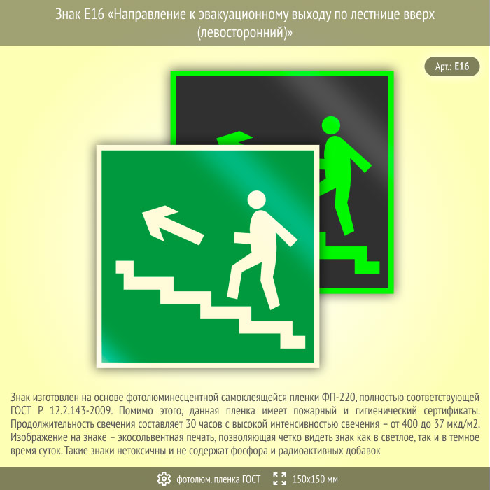 Знак E16 «Направление к эвакуационному выходу по лестнице вверх (левосторонний)» (фотолюминесцентная пленка ГОСТ 34428-2018, 150х150 мм) в Рыбинске купить