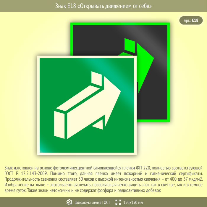 Знак E18 «Открывать движением от себя» (фотолюминесцентная пленка ГОСТ 34428-2018, 150х150 мм) в Рыбинске купить