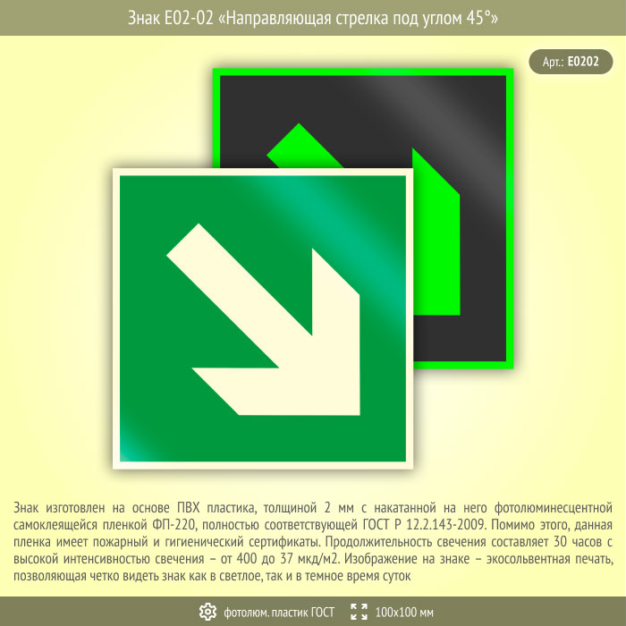 Знак E02-02 «Направляющая стрелка под углом 45°» (фотолюминесцентный пластик ГОСТ 34428-2018, 100х100 мм) в Рыбинске купить