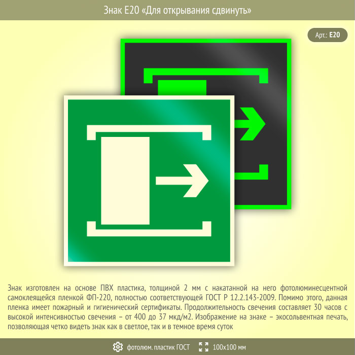 Знак E20 «Для открывания сдвинуть» (фотолюминесцентный пластик ГОСТ 34428-2018, 100х100 мм) в Рыбинске купить