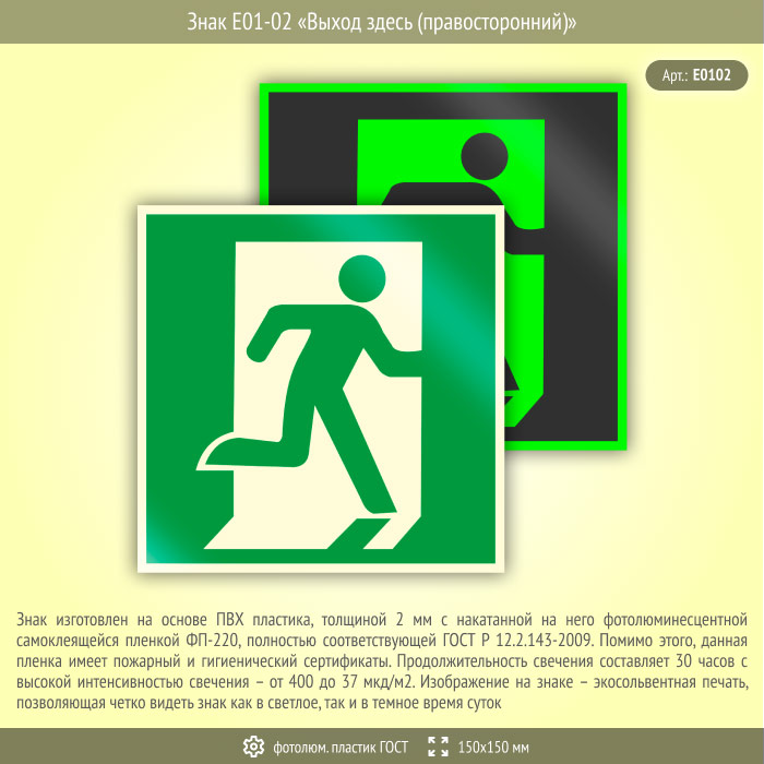 Знак E01-02 «Выход здесь (правосторонний)» (фотолюминесцентный пластик ГОСТ 34428-2018, 150х150 мм) в Рыбинске купить