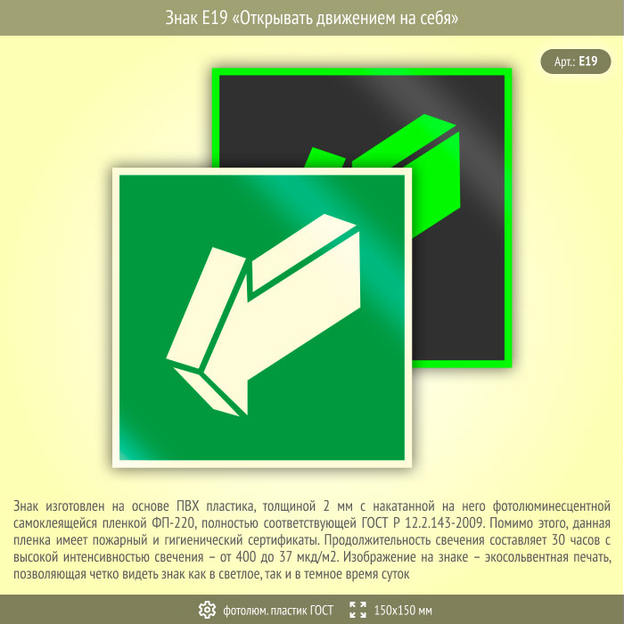 Знак E19 «Открывать движением на себя» (фотолюминесцентный пластик ГОСТ 34428-2018, 150х150 мм) в Рыбинске купить