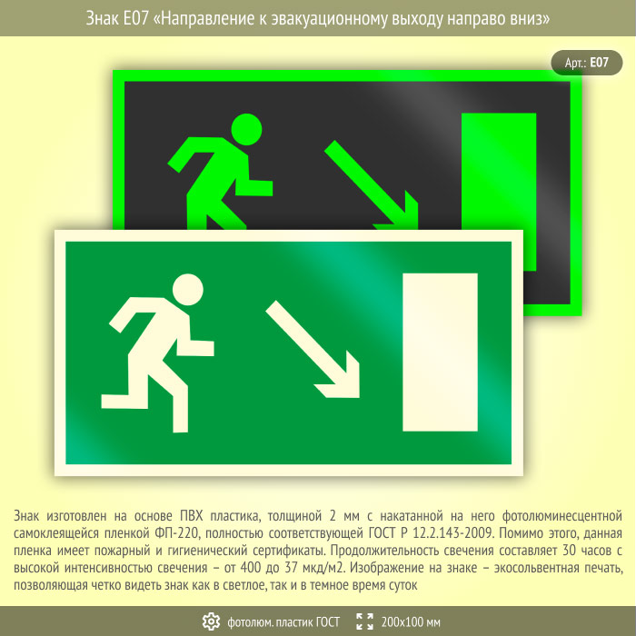 Знак E07 «Направление к эвакуационному выходу направо вниз» (фотолюминесцентный пластик ГОСТ 34428-2018, 200х100 мм) в Рыбинске купить