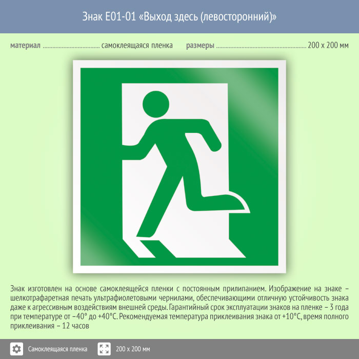 Знак E01-01 «Выход здесь (левосторонний)» (пленка, 200х200 мм) в Рыбинске купить