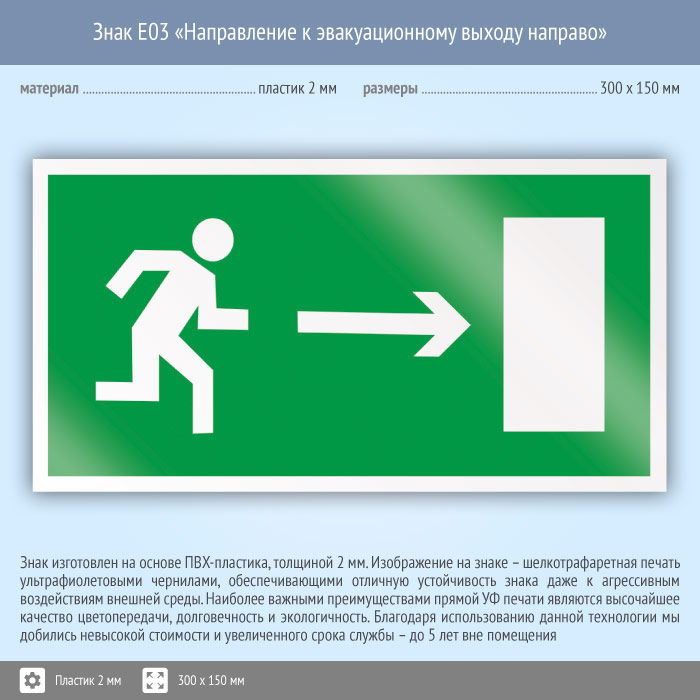 Знак E03 «Направление к эвакуационному выходу направо» (пластик, 300х150 мм) в Рыбинске купить