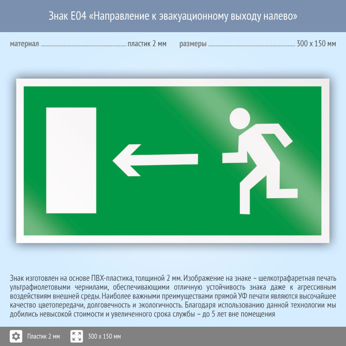 Знак E04 «Направление к эвакуационному выходу налево» (пластик, 300х150 мм) в Рыбинске купить