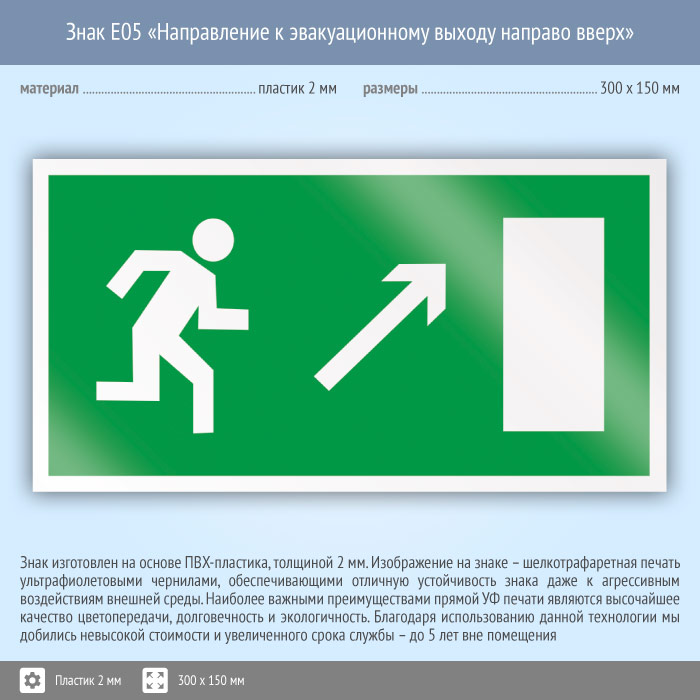 Знак E05 «Направление к эвакуационному выходу направо вверх» (пластик, 300х150 мм) в Рыбинске купить