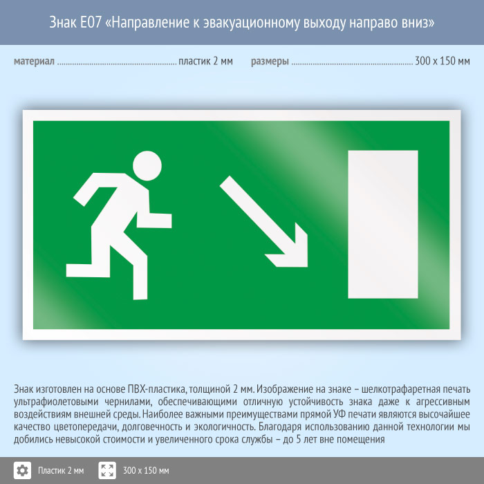 Знак E07 «Направление к эвакуационному выходу направо вниз» (пластик, 300х150 мм) в Рыбинске купить