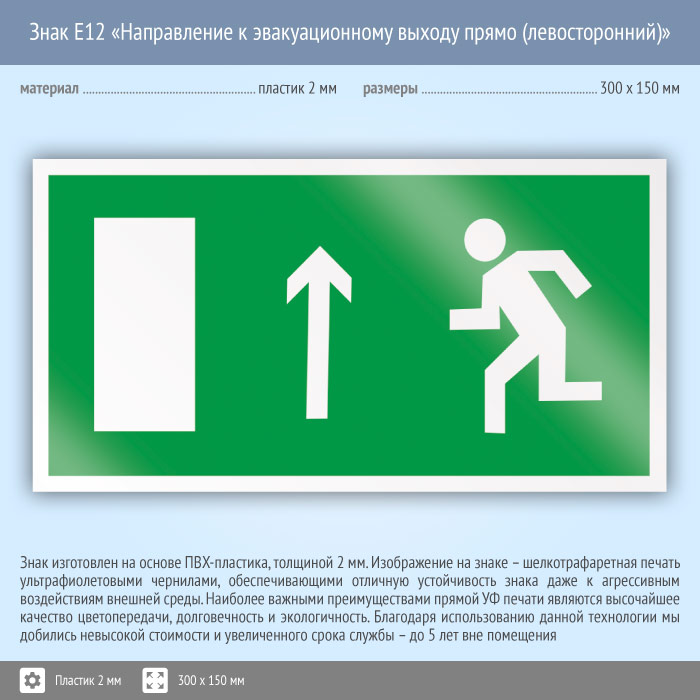 Знак E12 «Направление к эвакуационному выходу прямо (левосторонний)» (пластик, 300х150 мм) в Рыбинске купить