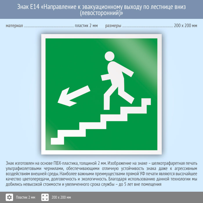Знак E14 «Направление к эвакуационному выходу по лестнице вниз (левосторонний)» (пластик, 200х200 мм) в Рыбинске купить