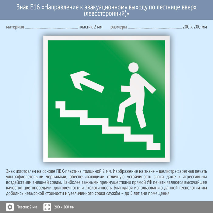 Знак E16 «Направление к эвакуационному выходу по лестнице вверх (левосторонний)» (пластик, 200х200 мм) в Рыбинске купить