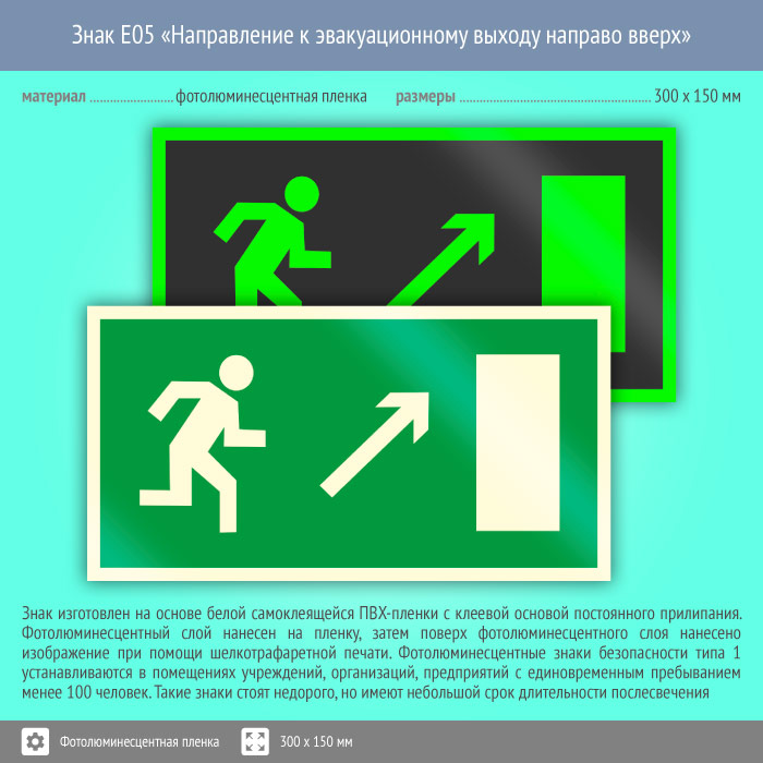 Знак E05 «Направление к эвакуационному выходу направо вверх» (фотолюминесцентная пленка, 300х150 мм) в Рыбинске купить
