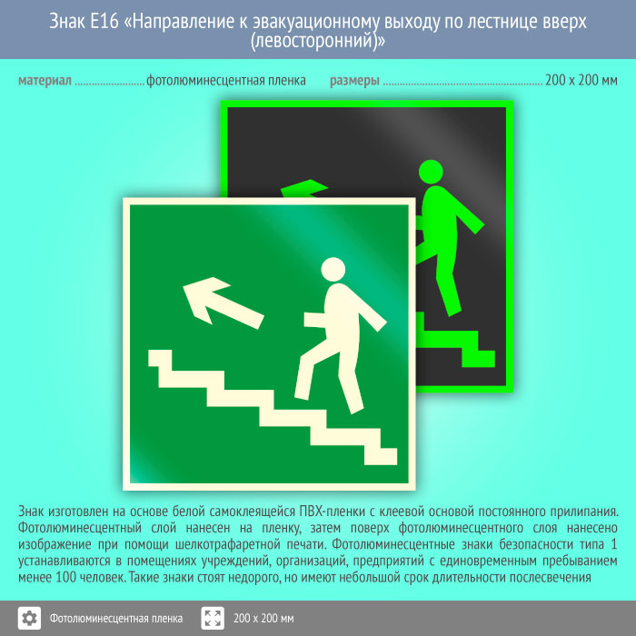 Знак E16 «Направление к эвакуационному выходу по лестнице вверх (левосторонний)» (фотолюминесцентная пленка, 200х200 мм) в Рыбинске купить