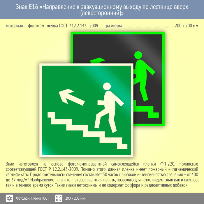Знак E16 «Направление к эвакуационному выходу по лестнице вверх (левосторонний)» (фотолюминесцентная пленка ГОСТ 34428-2018, 200х200 мм) в Рыбинске купить