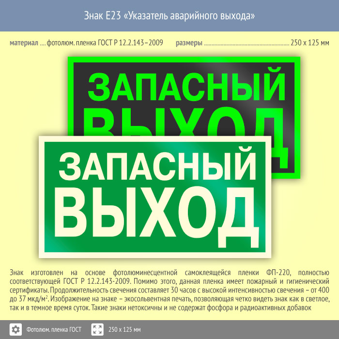 Знак E23 «Указатель запасного выхода» (устаревший) (фотолюминесцентная пленка ГОСТ 34428-2018, 250х125 мм) в Рыбинске купить
