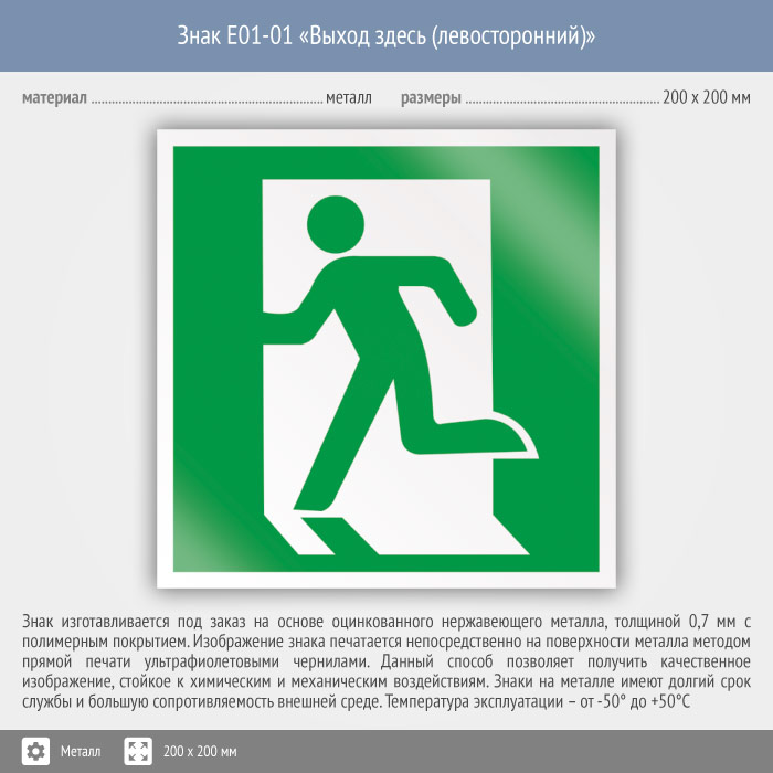 Знак E01-01 «Выход здесь (левосторонний)» (металл, 200х200 мм) в Рыбинске купить