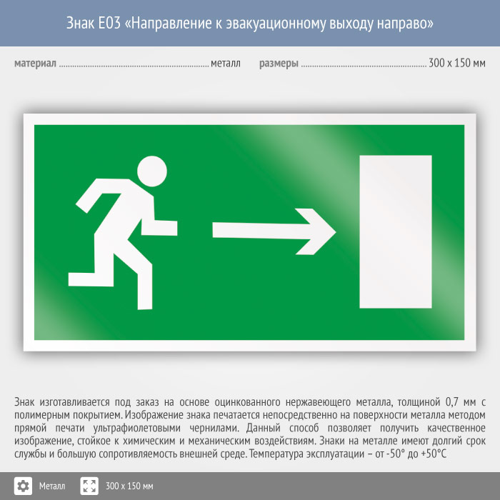 Знак E03 «Направление к эвакуационному выходу направо» (металл, 300х150 мм) в Рыбинске купить