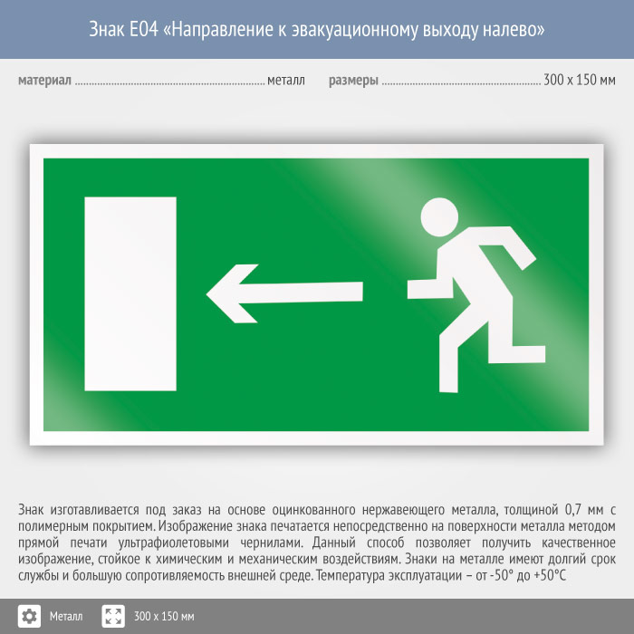 Знак E04 «Направление к эвакуационному выходу налево» (металл, 300х150 мм) в Рыбинске купить