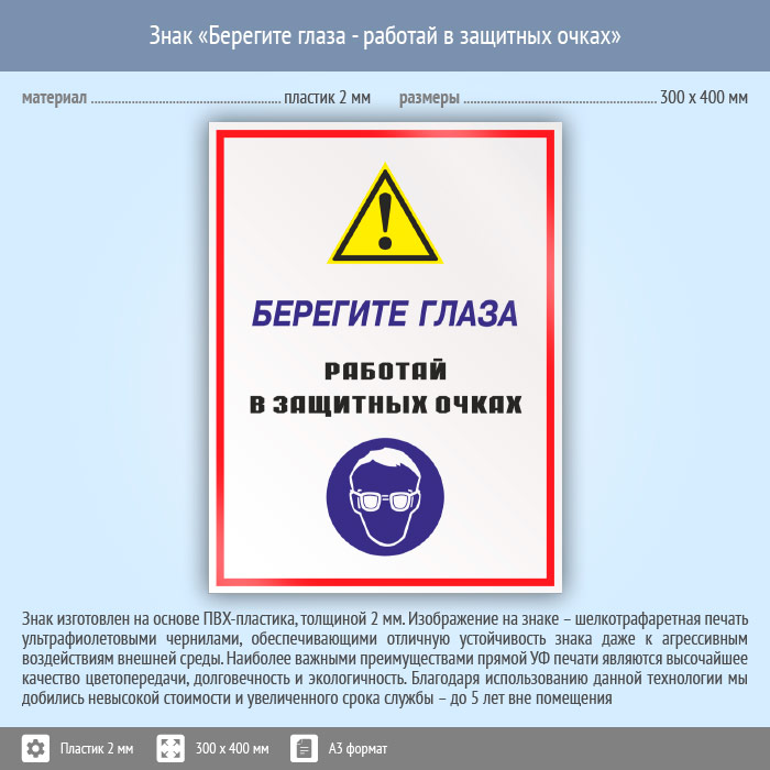 Знак «Берегите глаза - работай в защитных очках», КЗ-04 (пластик, 300х400 мм) в Рыбинске купить