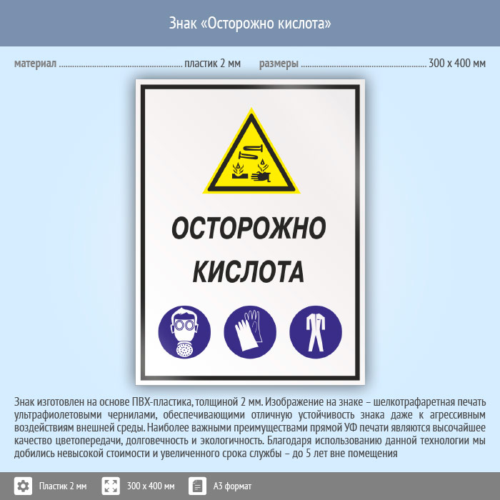 Знак «Осторожно кислота», КЗ-61 (пластик, 300х400 мм) в Рыбинске купить
