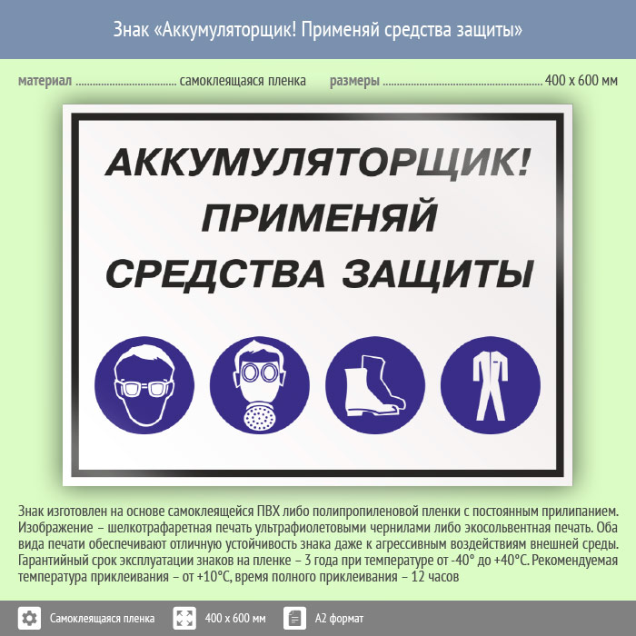 Знак «Аккумуляторщик! Применяй средства защиты», КЗ-02 (пленка, 600х400 мм) в Рыбинске купить