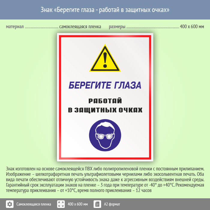 Знак «Берегите глаза - работай в защитных очках», КЗ-04 (пленка, 400х600 мм) в Рыбинске купить