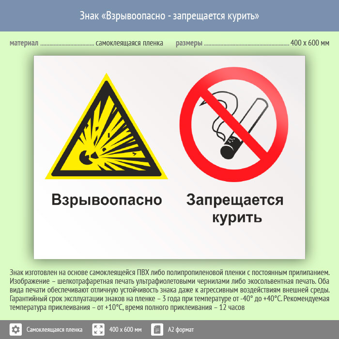 Знак «Взрывоопасно - запрещается курить», КЗ-06 (пленка, 600х400 мм) в Рыбинске купить