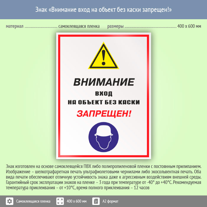 Знак «Внимание вход на объект без каски запрещен!», КЗ-13 (пленка, 400х600 мм) в Рыбинске купить