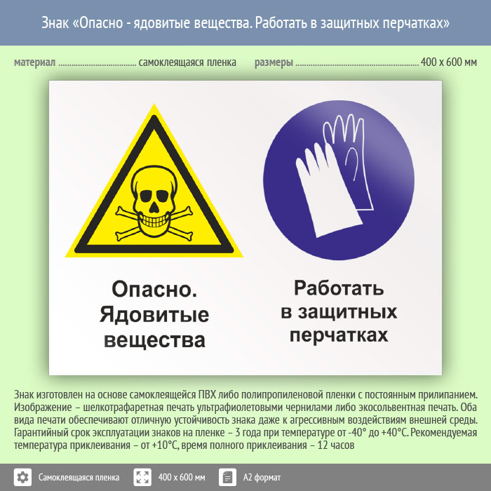 Знак «Опасно - ядовитые вещества. Работать в защитных перчатках», КЗ-43 (пленка, 600х400 мм) в Рыбинске купить