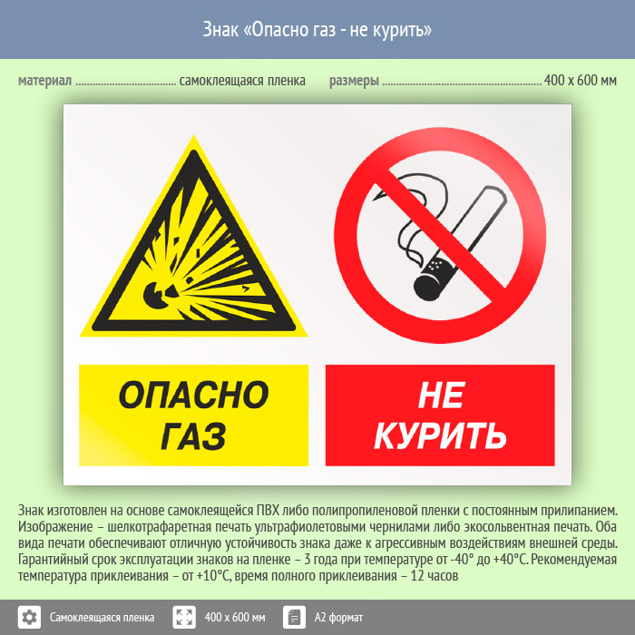 Знак «Опасно газ - не курить», КЗ-44 (пленка, 600х400 мм) в Рыбинске купить