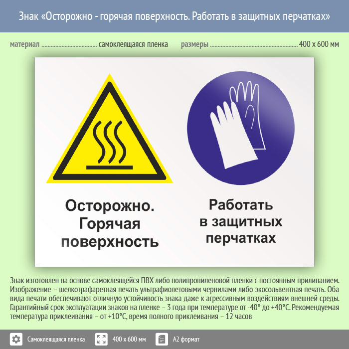 Знак «Осторожно - горячая поверхность. Работать в защитных перчатках», КЗ-55 (пленка, 600х400 мм) в Рыбинске купить