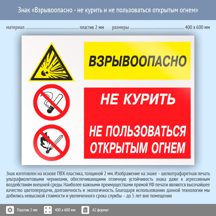 Знак «Взрывоопасно - не курить и не пользоваться открытым огнем», КЗ-09 (пластик, 600х400 мм) в Рыбинске купить