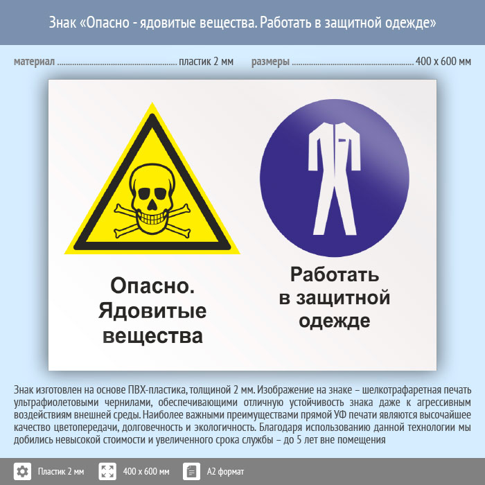 Знак «Опасно - ядовитые вещества. Работать в защитной одежде», КЗ-42 (пластик, 600х400 мм) в Рыбинске купить