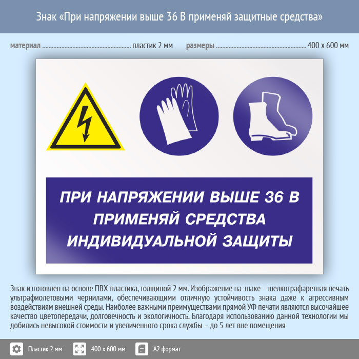 Знак «При напряжении выше 36 В применяй защитные средства», КЗ-71 (пластик, 600х400 мм) в Рыбинске купить