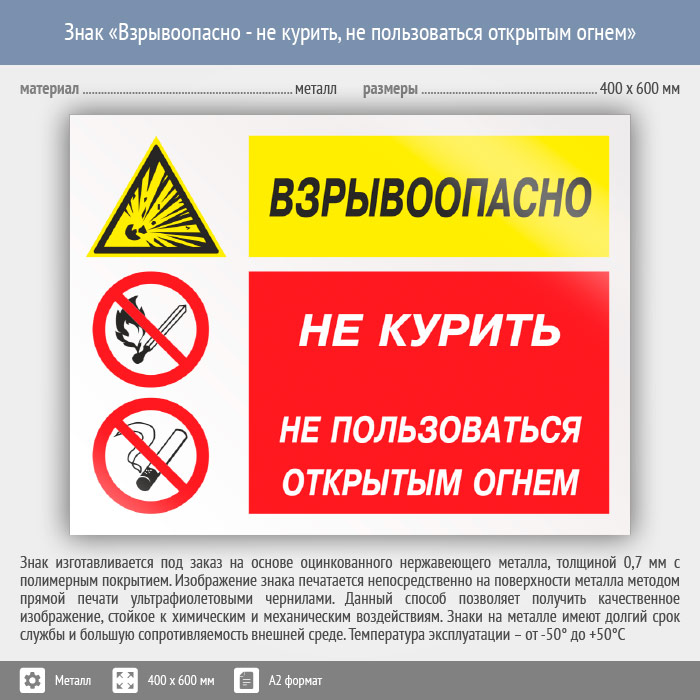 Знак «Взрывоопасно - не курить, не пользоваться открытым огнем», КЗ-05 (металл, 600х400 мм) в Рыбинске купить