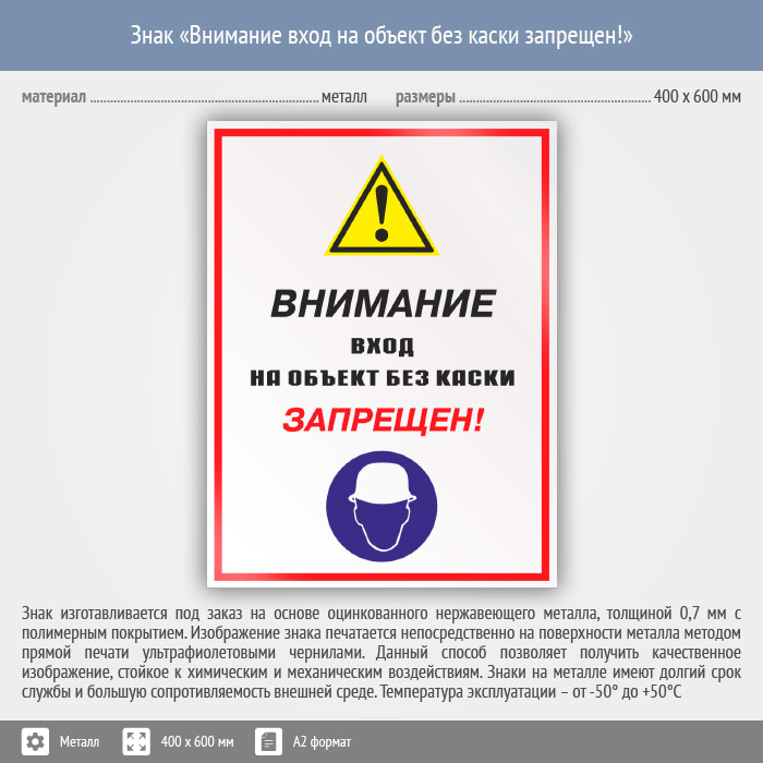 Знак «Внимание вход на объект без каски запрещен!», КЗ-13 (металл, 400х600 мм) в Рыбинске купить