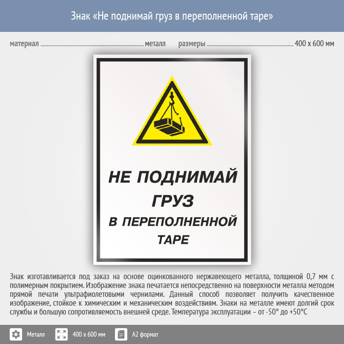 Знак «Не поднимай груз в переполненной таре», КЗ-26 (металл, 400х600 мм) в Рыбинске купить