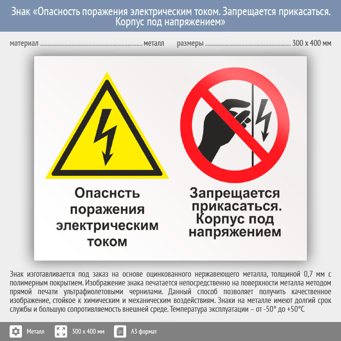 Знак «Опасность поражения электрическим током. Запрещается прикасаться. Корпус под напряжением», КЗ-47 (металл, 400х300 мм) в Рыбинске купить