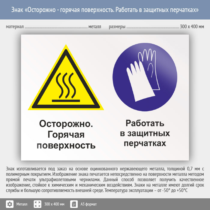 Знак «Осторожно - горячая поверхность. Работать в защитных перчатках», КЗ-55 (металл, 400х300 мм) в Рыбинске купить