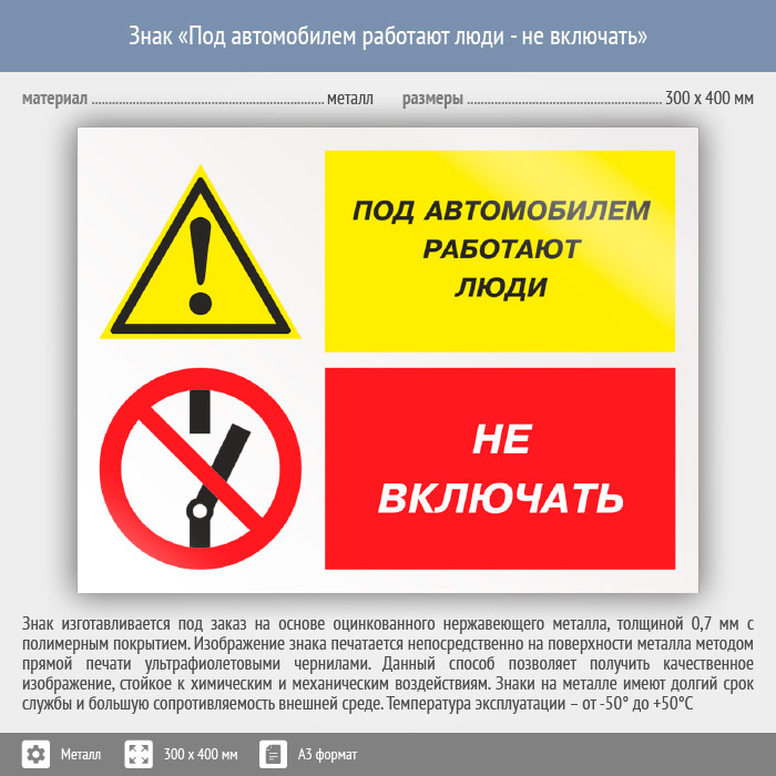 Знак «Под автомобилем работают люди - не включать», КЗ-65 (металл, 400х300 мм) в Рыбинске купить